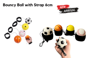 Fun on the go! This 6cm bouncy ball with strap is perfect for kids and adults to play anywhere—attach it to your bag or belt for endless bouncing fun.