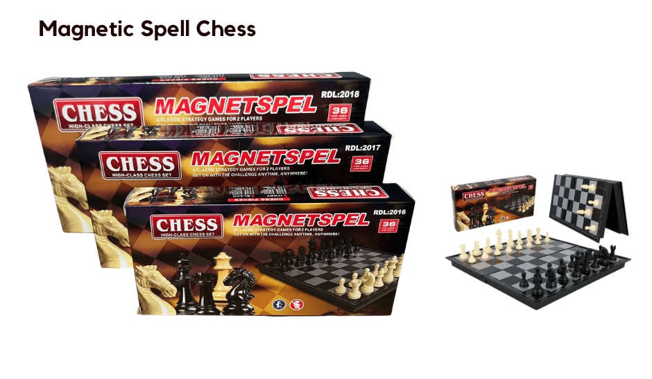 A compact and portable magnetic chess set designed for easy play anywhere. The magnetic pieces stay firmly in place, making it perfect for travel, school, or casual home games. Great for beginners and young learners.